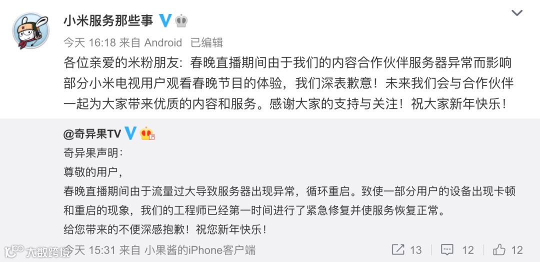 也是看了这条声明,小白才后知后觉知道原来春晚当天还发生过这档子事儿,不过这声明来的也算晚的,毕竟春晚已经过去好几天了,加班的小编也是不容易。发文前问了几个小米电视用户有一个还有印象说当晚用奇异果看春晚确实出现了掉线情况,不过当时也没在意,继续低头玩手机了