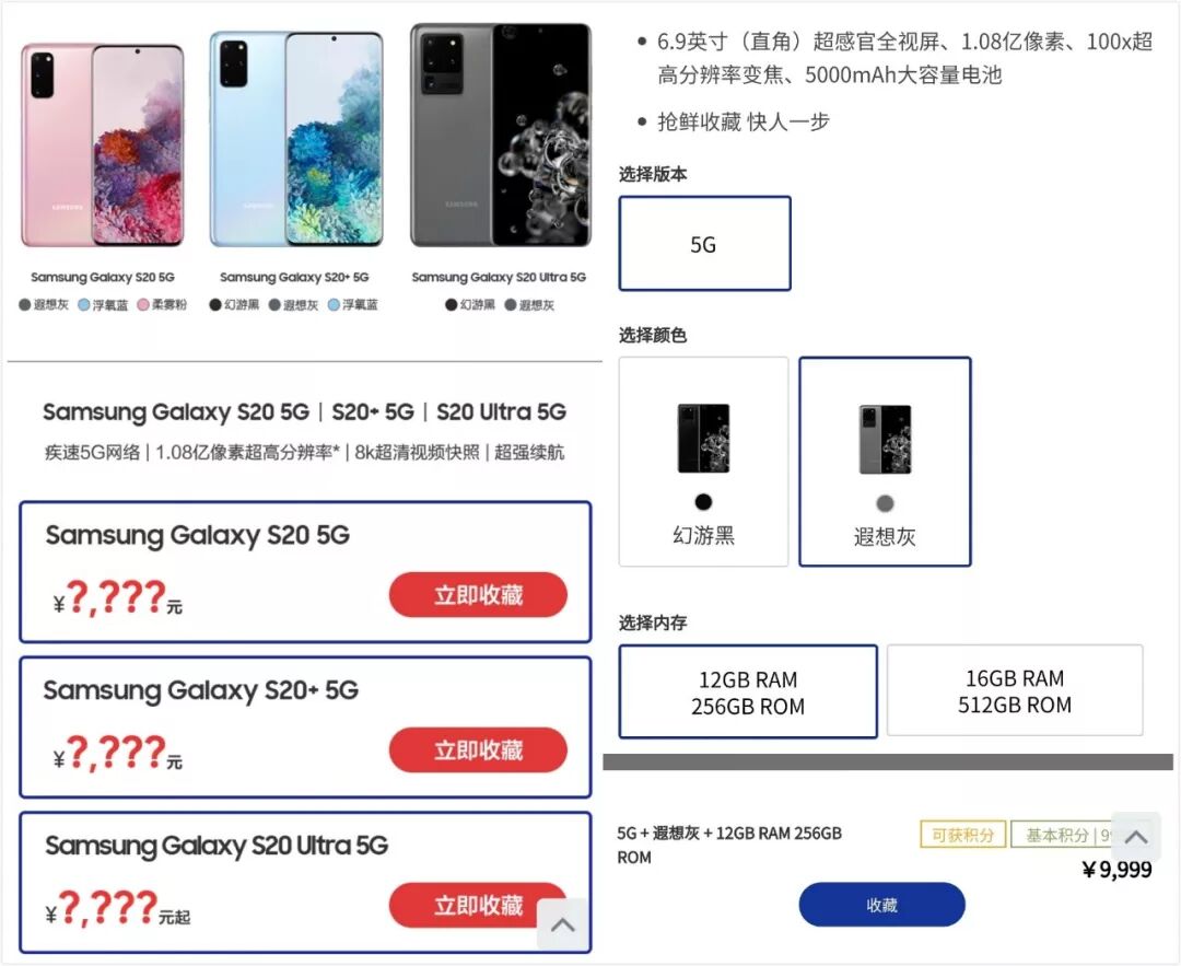 页面显示,三星Galaxy S20 Ultra国行提供12GB+256GB、16GB+512GB两个储存规格(LPDDR5+UFS 3.0),提供遐想灰、幻游黑2个配色,其中12GB+256GB国行价为9999元。不过小白去官网查看的时候已经没有9999的字样,所以最终售价如何还有待确认。