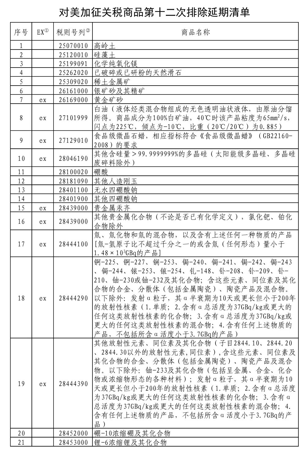 据财政部网站消息,国务院关税税则委员会近日发布《关于对美加征关税商品第十二次排除延期清单的公告》。