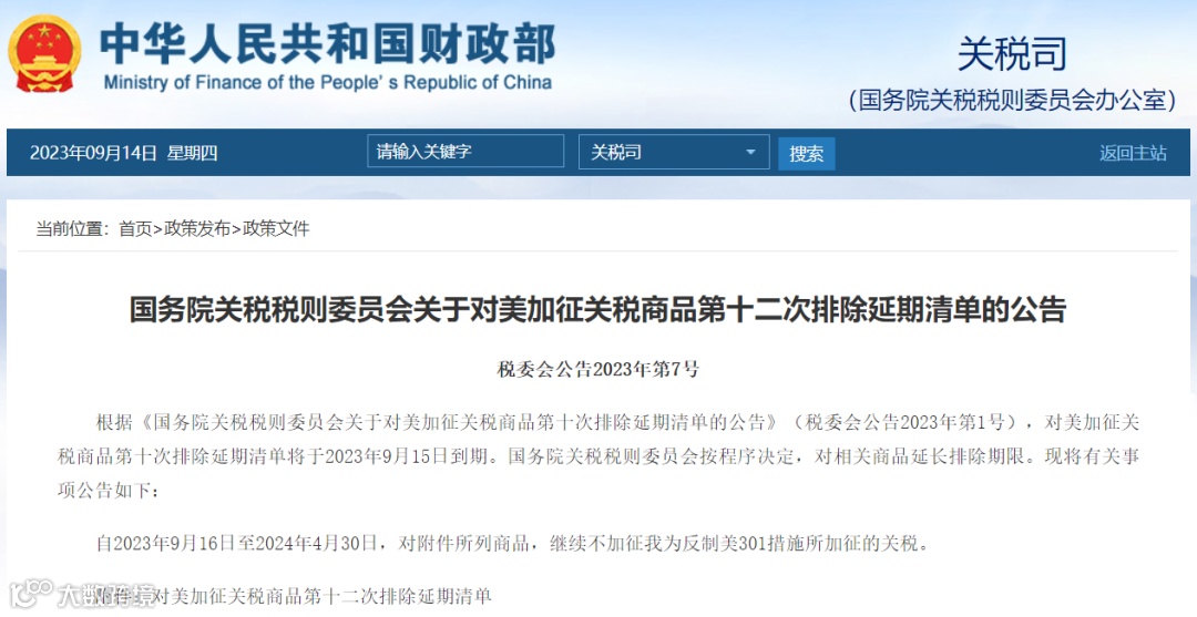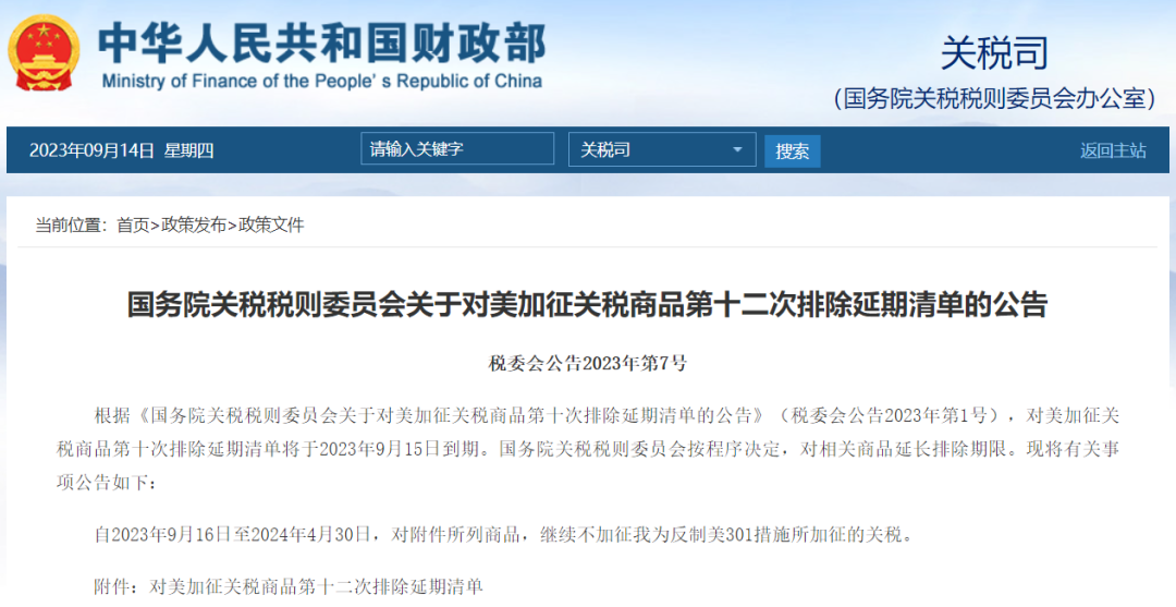 公告指出,自2023年9月16日至2024年4月30日,对附件所列商品,继续不加征我为反制美301措施所加征的关税。
