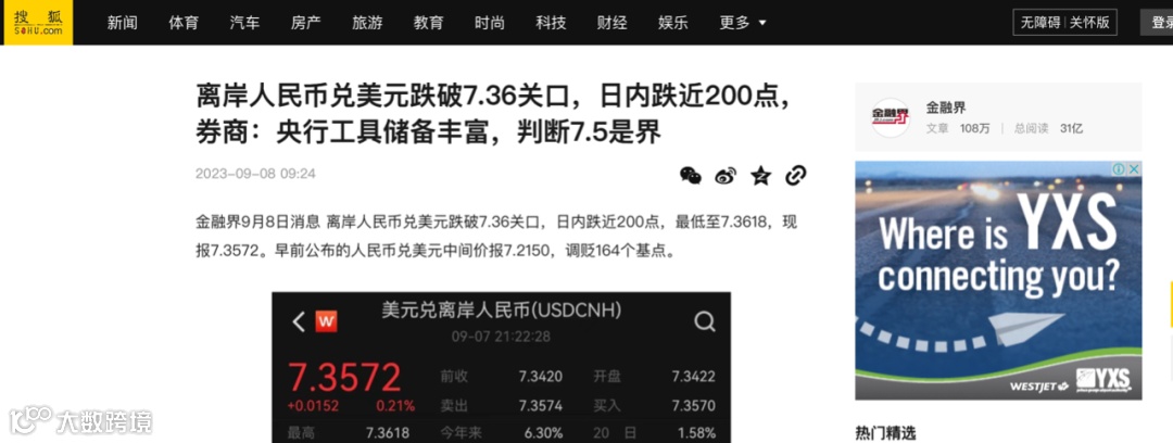 国内媒体金融界则以《离岸人民币兑美元跌破7.36关口,日内跌近200点,券商:央行工具储备丰富,判断7.5是界》为题,预测人民币美元汇率的下一个整数关是7.5。