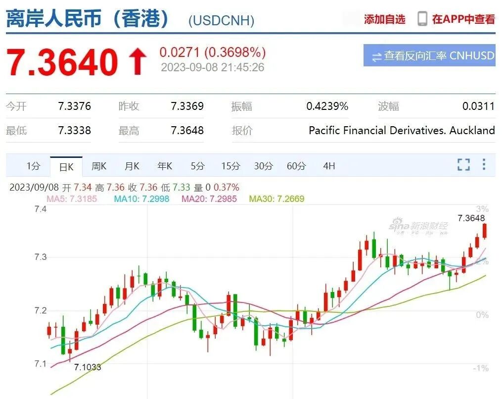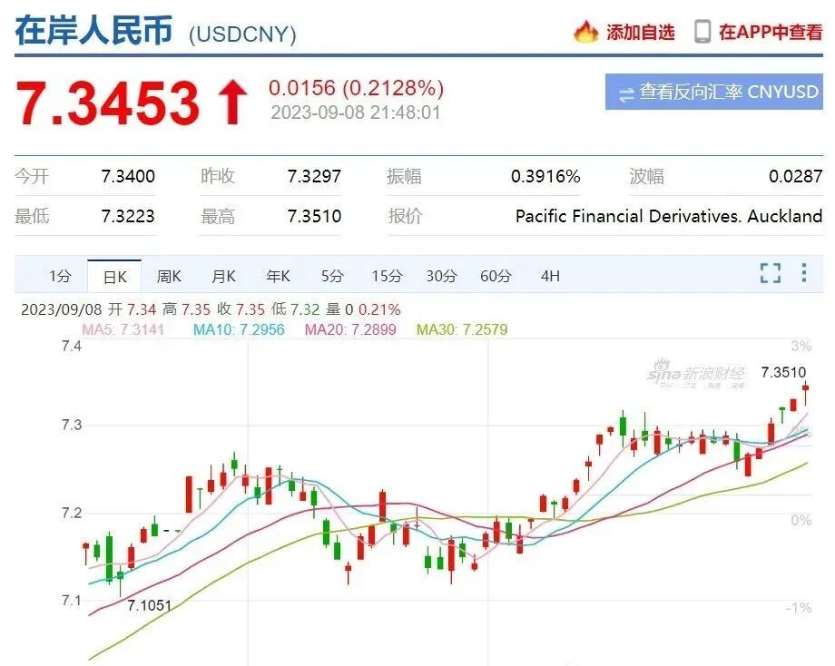 该报指出,9月8日,在岸、离岸人民币对美元汇率承压下挫,双双创下2010年6月汇改以来的新低。截至11时30分,在岸人民币对美元汇率最低触及7.3478,日内贬值逾0.2%;离岸人民币对美元汇率最低下探至7.36关口下方,日内贬值超200点。近期,离岸人民币汇率围绕7.35关口反复拉扯,调整压力加大,这背后一边是美元指数不断走强带来的被动贬值,另一边是国内稳增长政策效应仍待显现。