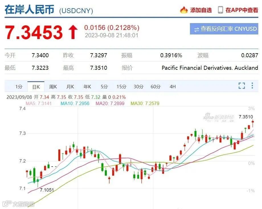 在岸人民币对美元跌破去年11月创下的15年低点7.3280,最低探至7.3478,创2007年12月以来新低。