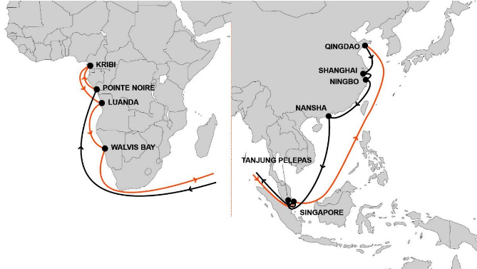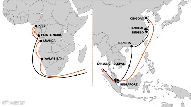 调整航线服务将挂靠:青岛-上海-宁波-广州南沙-丹戎帕拉帕斯-新加坡-黑角-克里比-罗安达-鲸湾港-新加坡-青岛。