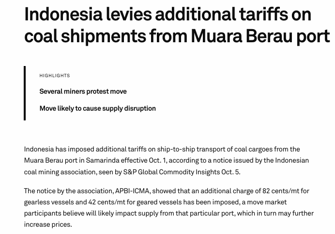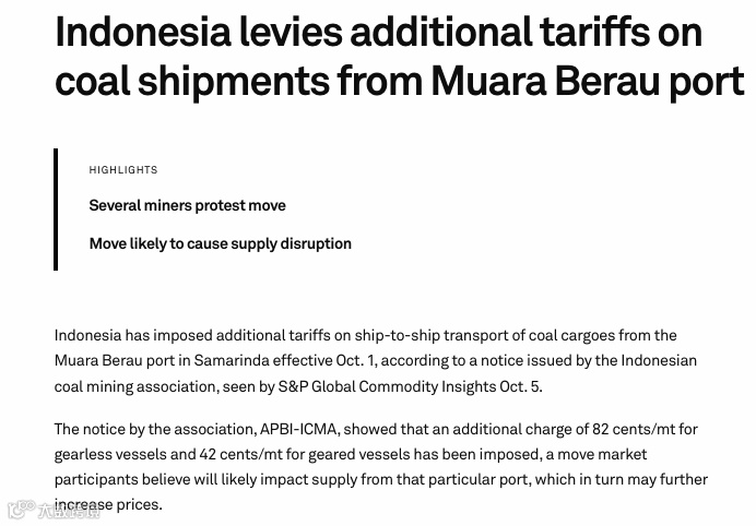 据标普全球商品洞察消息,印尼已从10月1日起对从Muara Berau港出发的煤炭货物船对船运输征收额外费用。