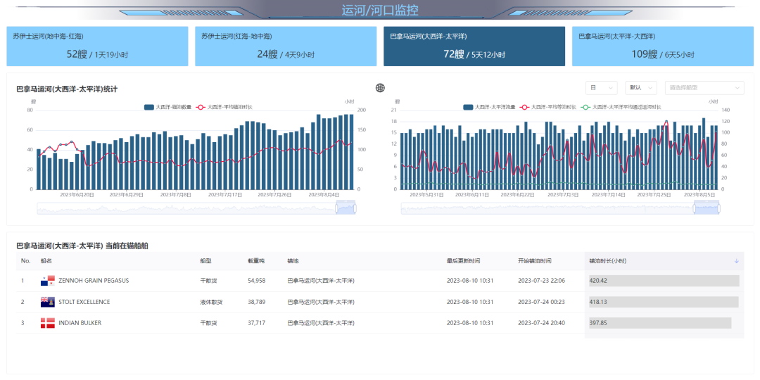 但据船视宝数据显示,自8月1日开始,巴拿马运河大西洋侧每日锚泊数量在56-76艘左右,巴拿马运河太平洋侧每日锚泊数量在83-110艘左右,平均等泊时长从1天左右拉长至3-4天。