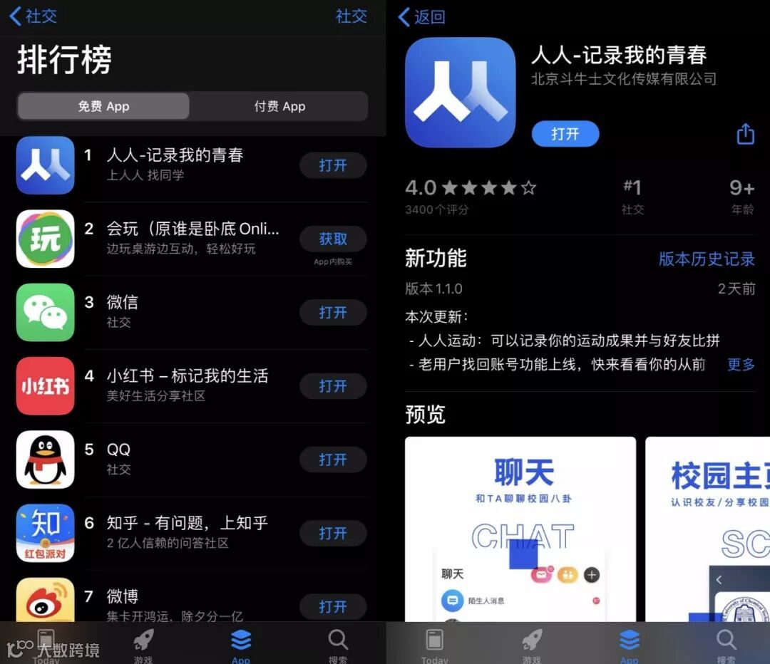 另外,今儿还看到一个暴露年龄的新闻,曾经著名的校园社交平台“人人网”近日“回归”,全新设计的人人App正式开启公测。据App Store排行榜显示,人人App目前在社交类排行榜位居第一名,总榜单位列第14名。