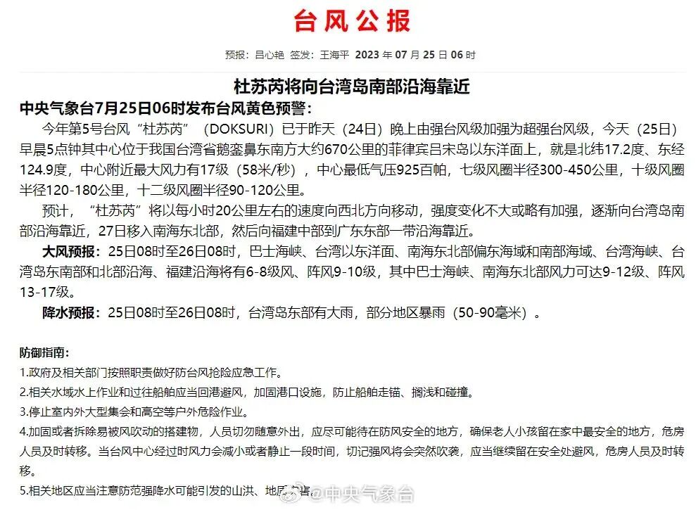 中央气象台7月25日6时发布台风黄色预警:今年第5号台风“杜苏芮”已于7月24日晚由强台风级加强为超强台风级。