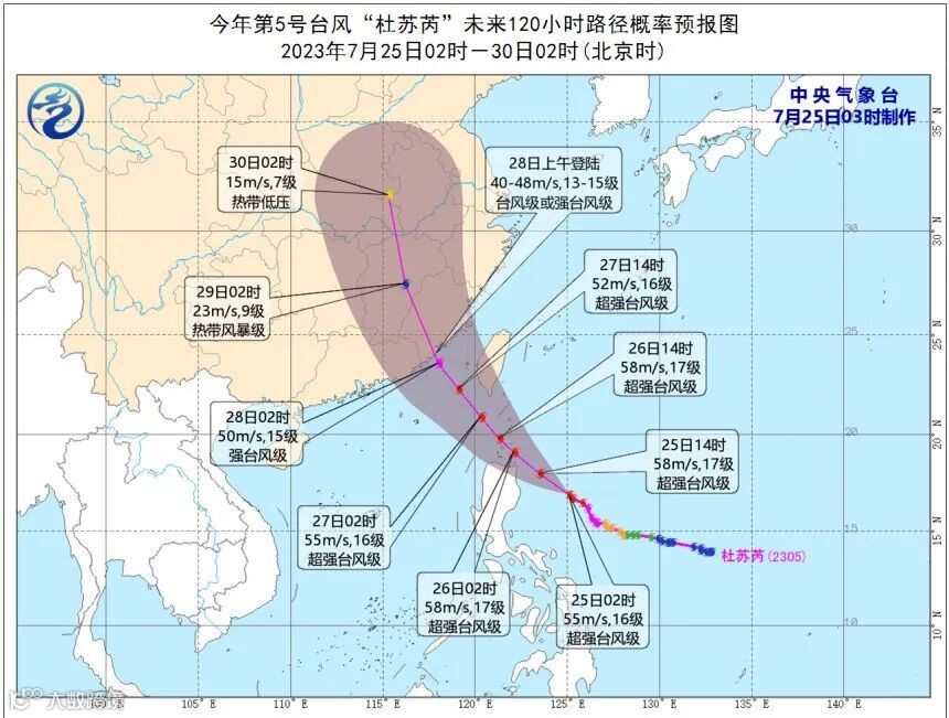 据悉,今天(25日)早上05时,今年第5号台风“杜苏芮”的中心在距离我国台湾岛南端的鹅銮鼻东南方向大概670公里处,中心附近的最大风速已经加强到了58米/秒。