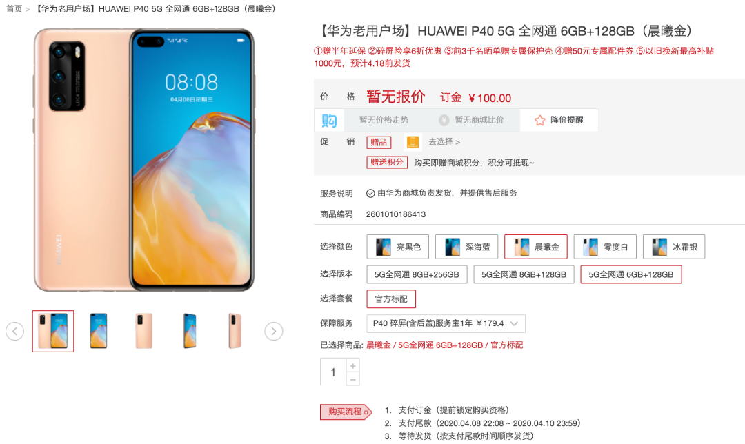 其中华为P40国行提供6+128GB、8+128GB、8+256GB三个储存规格,华为P40 Pro国行提供8+128GB、8+256GB、8+512GB三个储存规格,由于P40 Pro+要6月份上市,所以各大平台暂无上架信息。