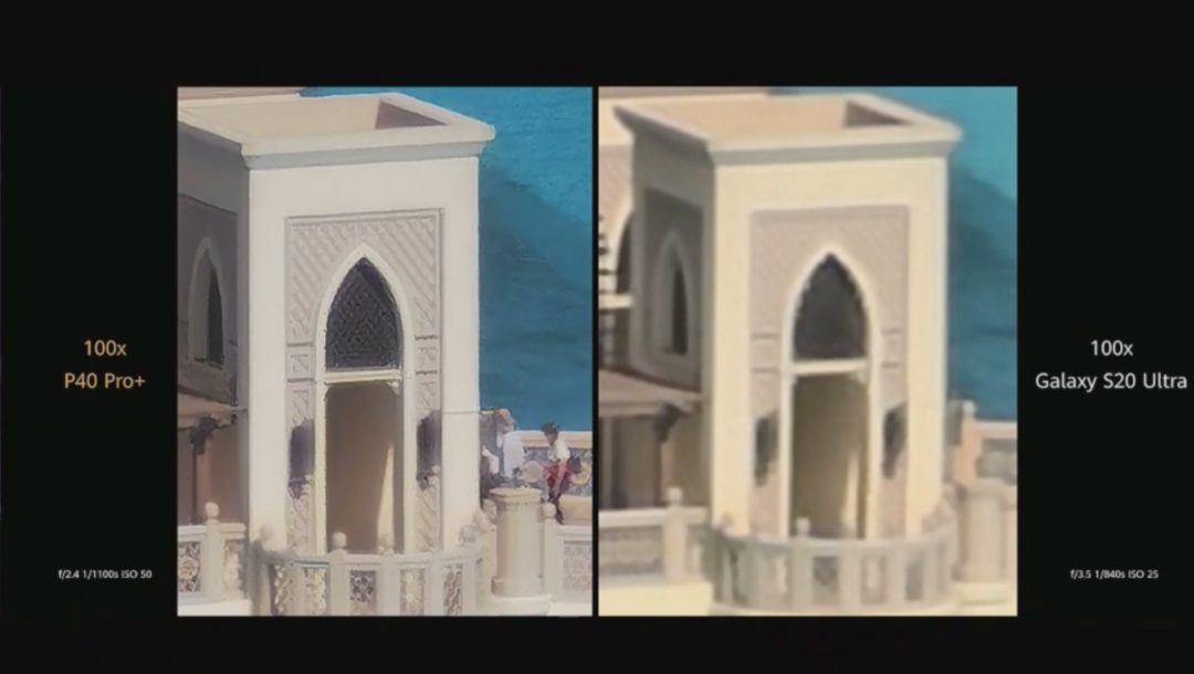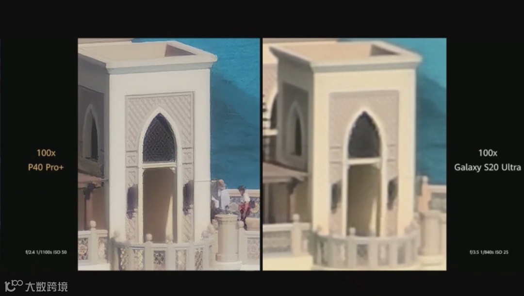 发布会上过程中华为还对比了三星Galaxy S20 Ultra的1.08亿像素传感器,底更大,进光量更高,细节更清晰等等。在变焦环节,同样是100倍变焦,华为P40 Pro+对比三星S20 Ultra细节更清晰。