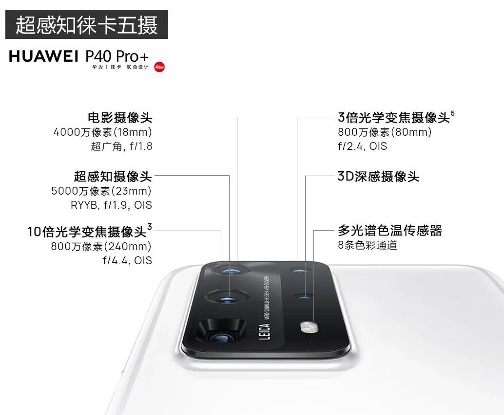华为P40 Pro+后置5摄:5000万像素(RYYB,23mm,F/1.9,有ois)+4000万像素超广角电影镜头(18mm,F/1.8)+800万像素长焦(80mm,F/2.4,有ois 支持3X光变变焦)+800万像素多反射潜望长焦(240mm,F/4.4,有ois,支持10倍光学变焦,20倍混合变焦,100倍数码变焦)+ToF。