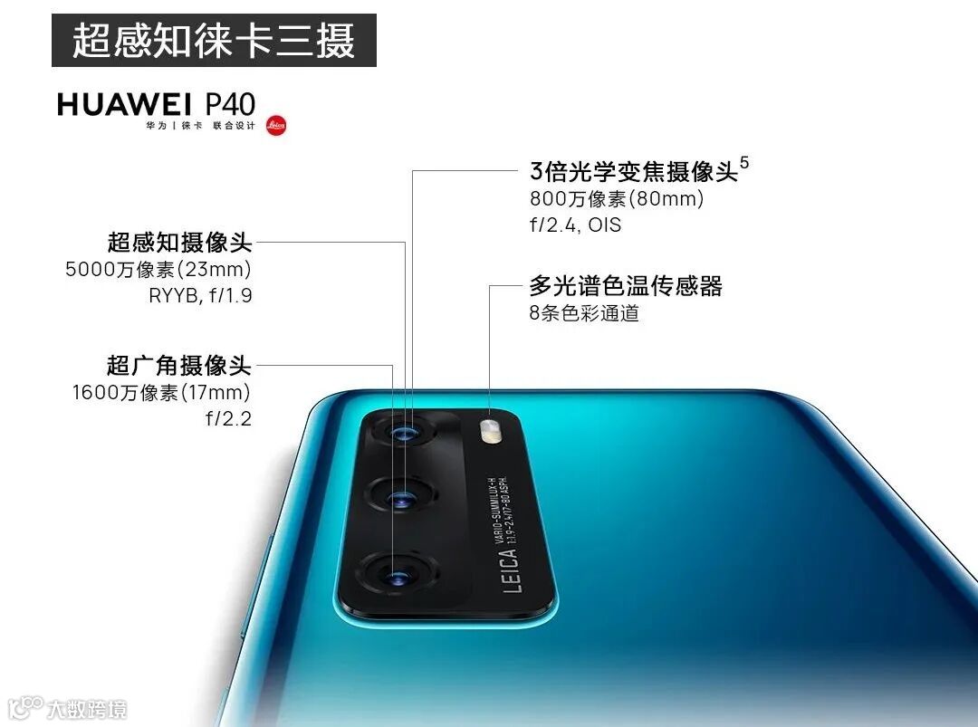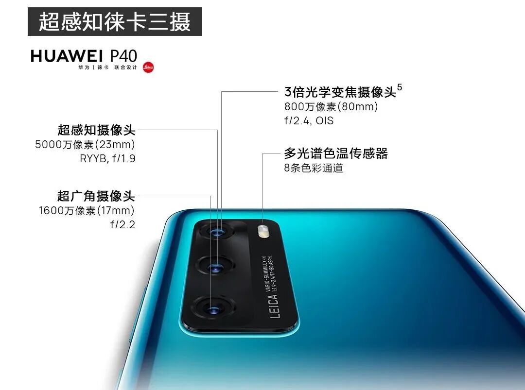 华为P40后置三摄:5000万像素主摄(RYYB,23mm,F/1.9)+1600万像素超广角(17mm F/2.2)+800万像素长焦(80mm,F/2.4,有ois,支持3倍光学变焦)。