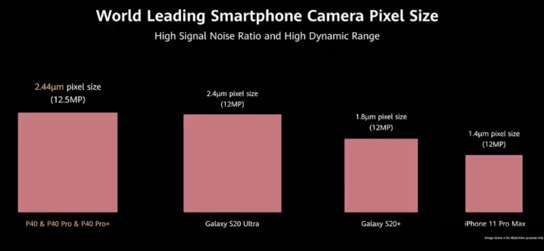 官方介绍华为P40系列这颗5000万像素 RYYB的主摄传感器底达1/1.28英寸,单位像素面积1.22μm,四合一像素面积2.44μm,进光量ISO大于20W,支持8核全像素对焦。