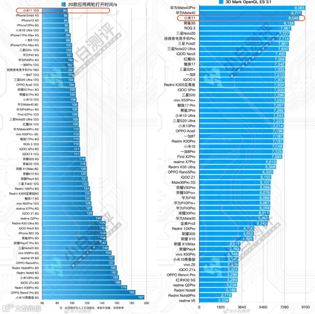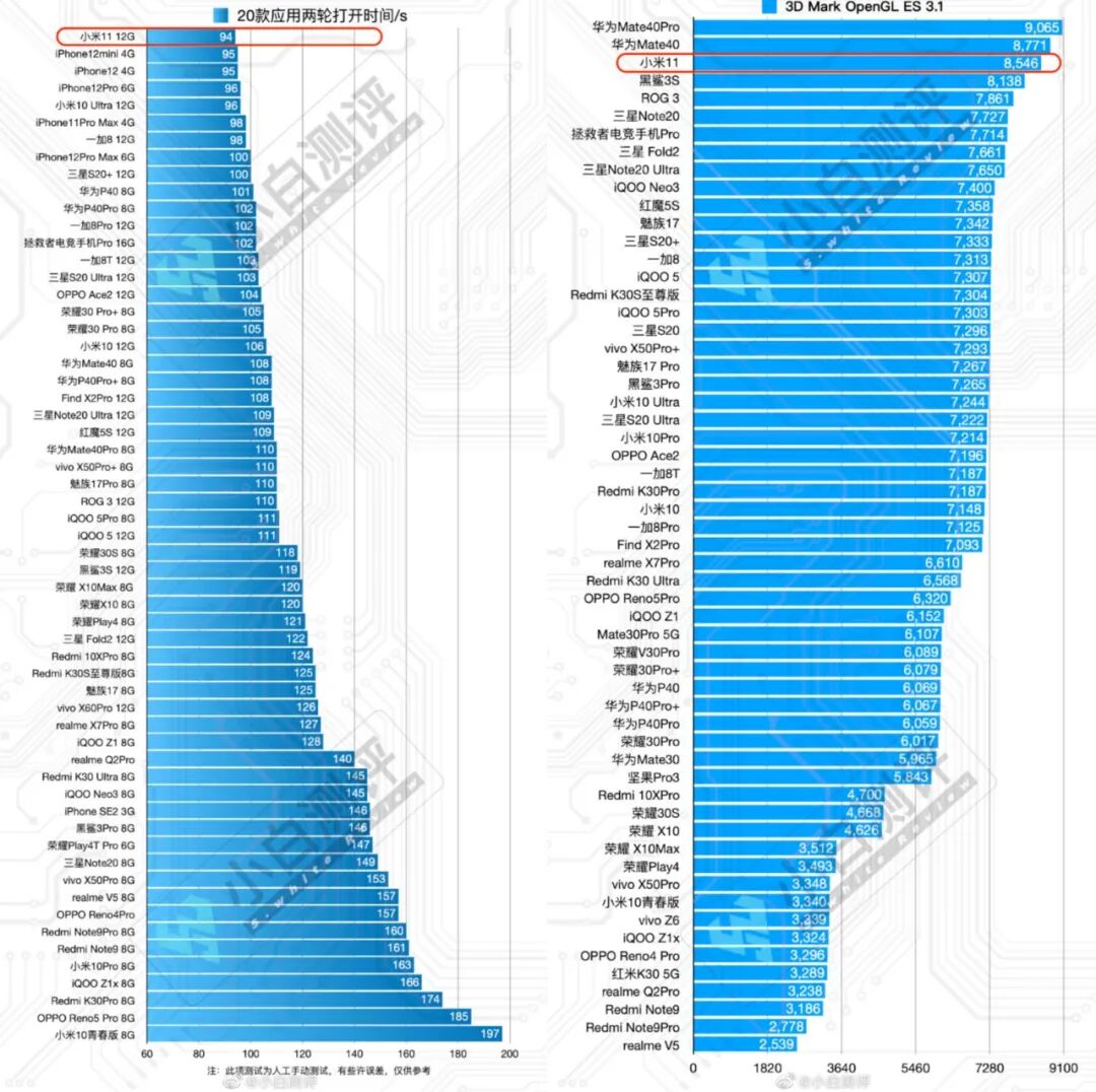 ⑤应用启动速度:小白测评数据库新20款应用两轮打开时间,三次测试取平均值,12G版本 小米11用时94s,位列第一(此项测试为人工手动测试,可能存在些许误差,仅供参考)。本次所有测试数据均基于小米11 测试时最新版MIUI 12.0.9.0系统测试所得,测试时室内温度25℃±2℃,更多详细数据请到小白测评数据库查看。