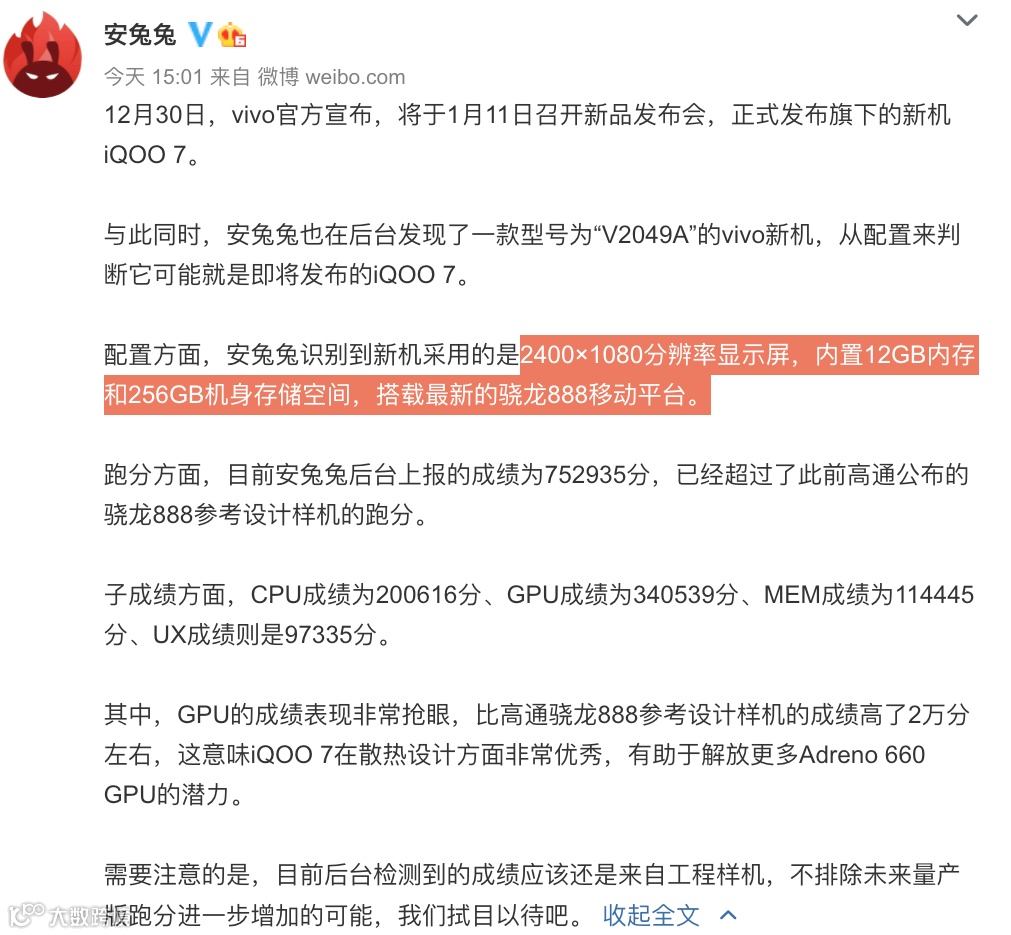 与此同时,今天下午安兔兔还曝光了iQOO 7的跑分:75W+,比小白实测的小米11 72W+高出不少,安兔兔还基于后台数据表示iQOO 7或采用一块2400*1080分辨率的120Hz屏幕刷新率屏,猜测应该是一块居中单挖孔、直屏。具体真机如何坐等正式发布了。