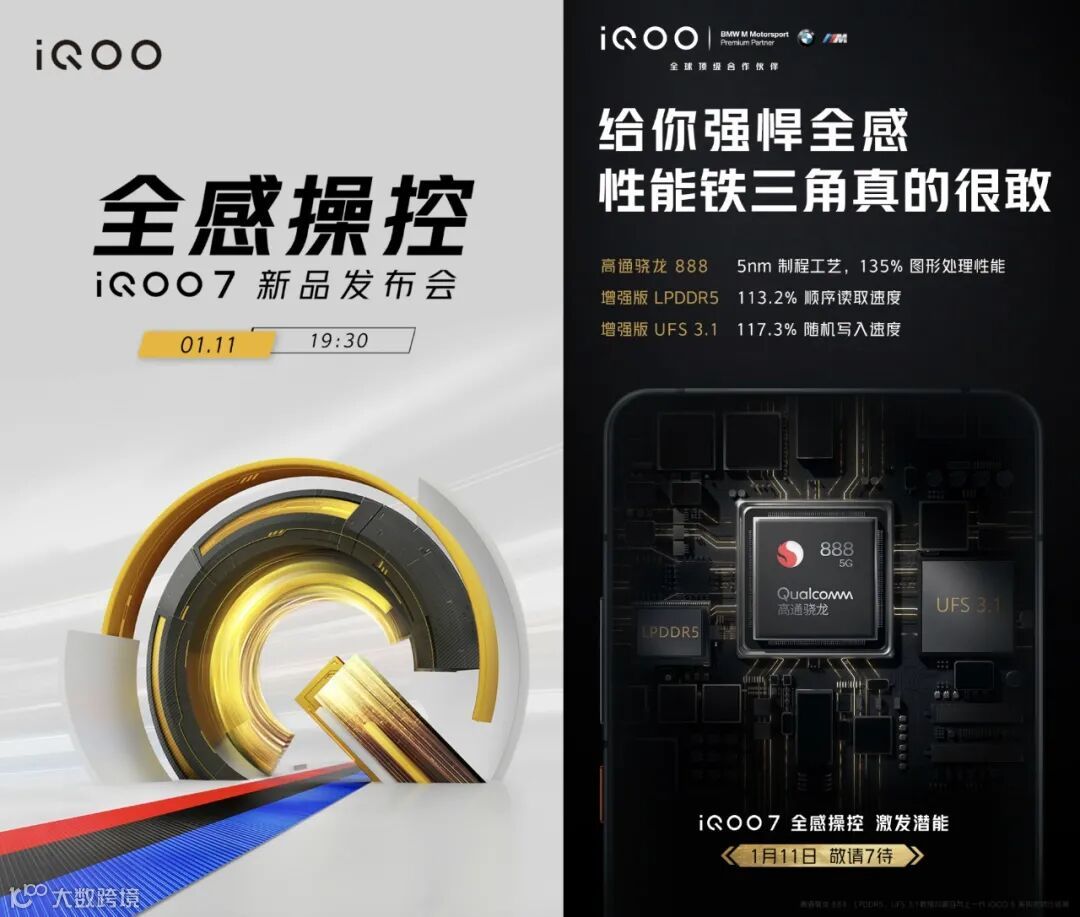 在小米11、vivo X60系列发布后,今天上午iQOO 7正式官宣了发布时间:1月11日晚上19:30。没有意外的话iQOO 7也将是「第二款」发布的骁龙888旗舰。