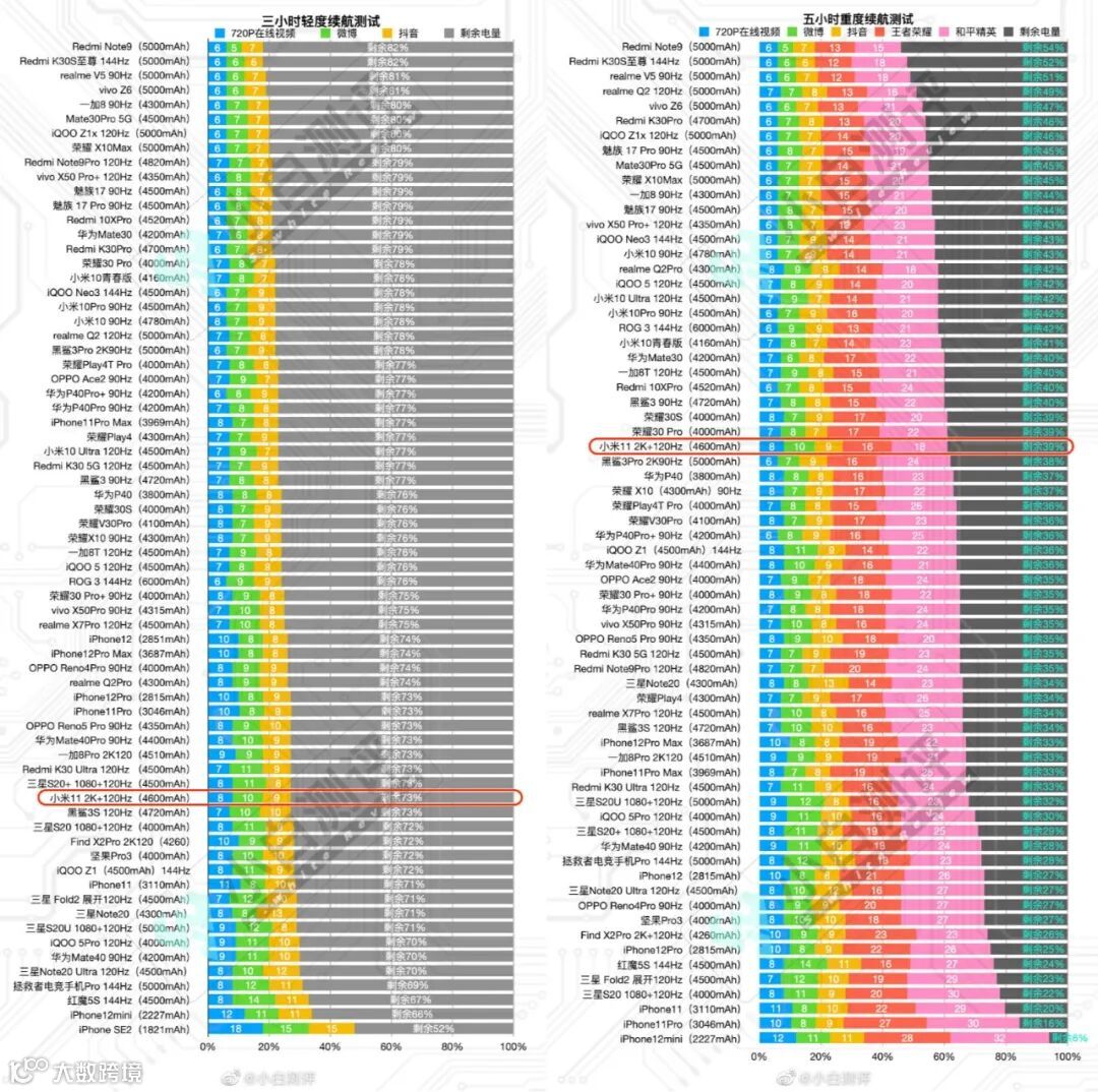 ③小米11续航: 小米11 2K+120Hz 三小时轻度续航测试剩余73%,五小时重度续航测试剩余39%(游戏测试条件:和平精英HDR高清+极限60帧)。