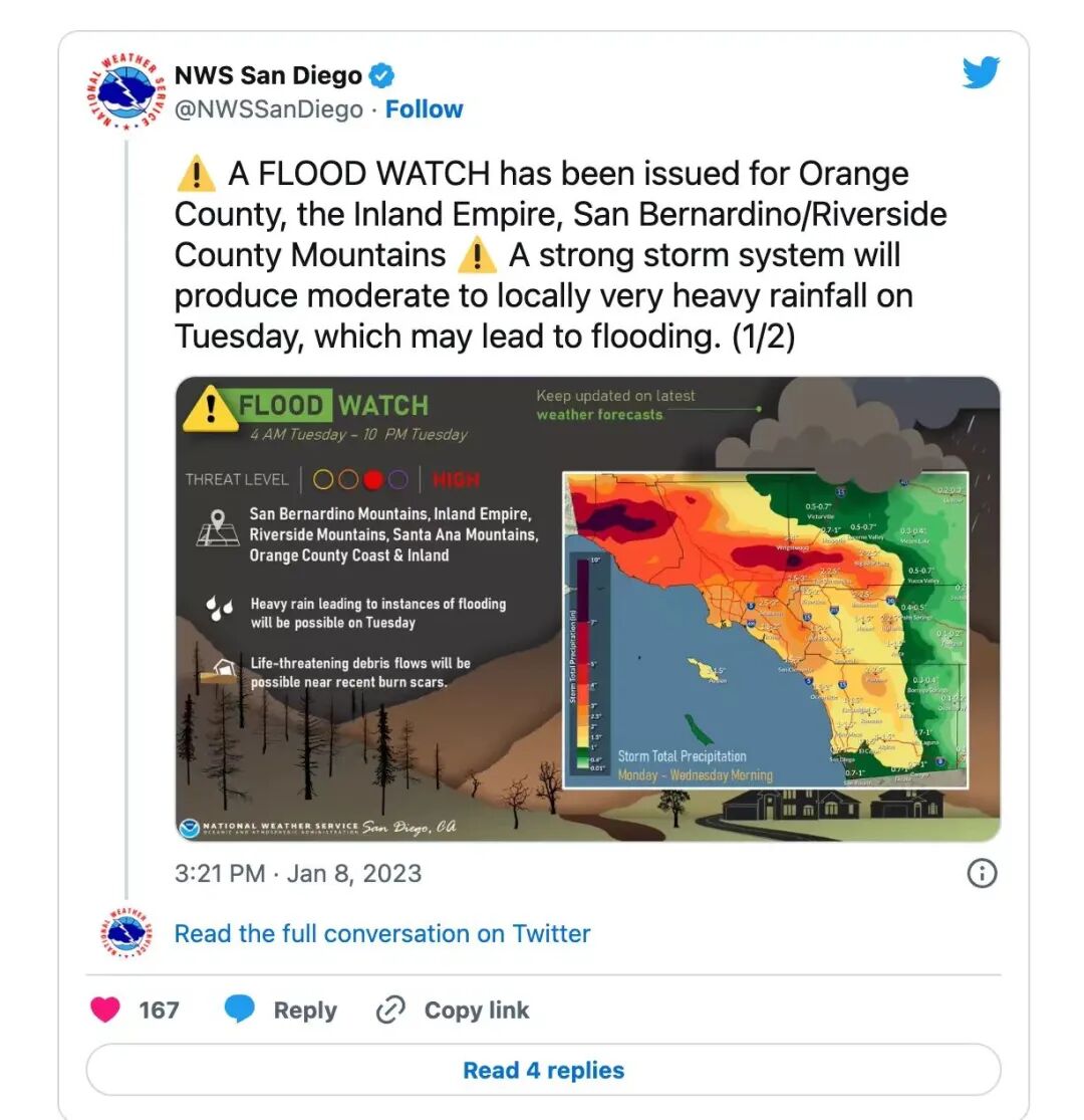 据悉,旧金山北部索诺玛县的大约13000名居民已收到疏散警告,预计当地的一条河流将在未来几天内泛滥成灾。