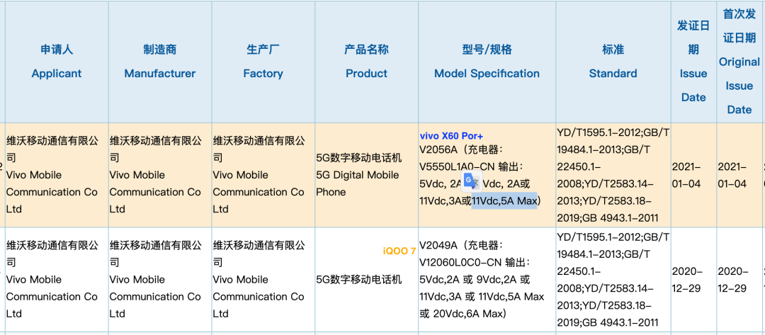 如上图所见,3C认证显示,型号为V2056A的vivo新机配备最大11V/5A 55W充电器,适配功率里无11V/4A,所以也代表着vivo X60 Pro+将配备55W快充,而非和之前一样送55W却实际仅支持44W。