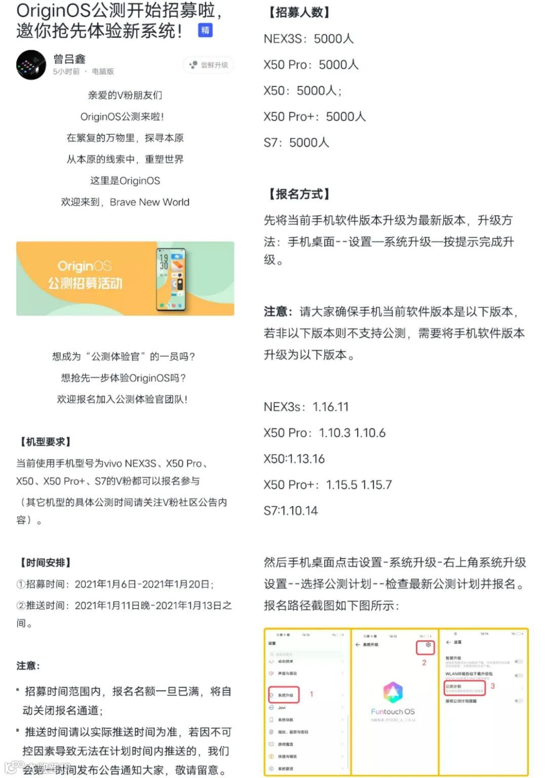 上图是vivo首批公测机型:vivo NEX3S、vivo X50、vivo X50 Pro、vivo X50 Pro+、vivo S7,需将原系统版本更新到最新后在【设置-系统升级-公测计划】申请即可。名额有限。
