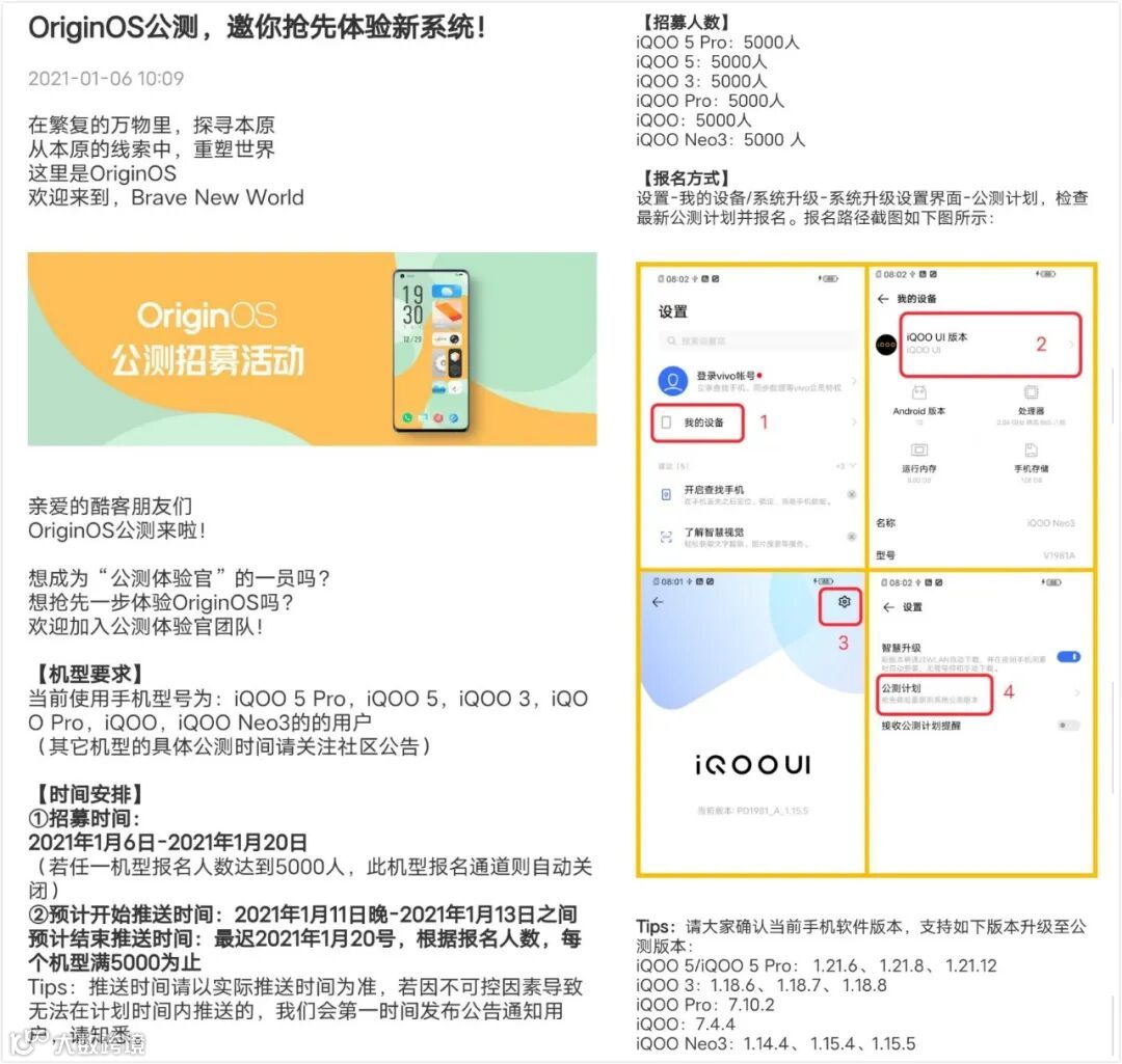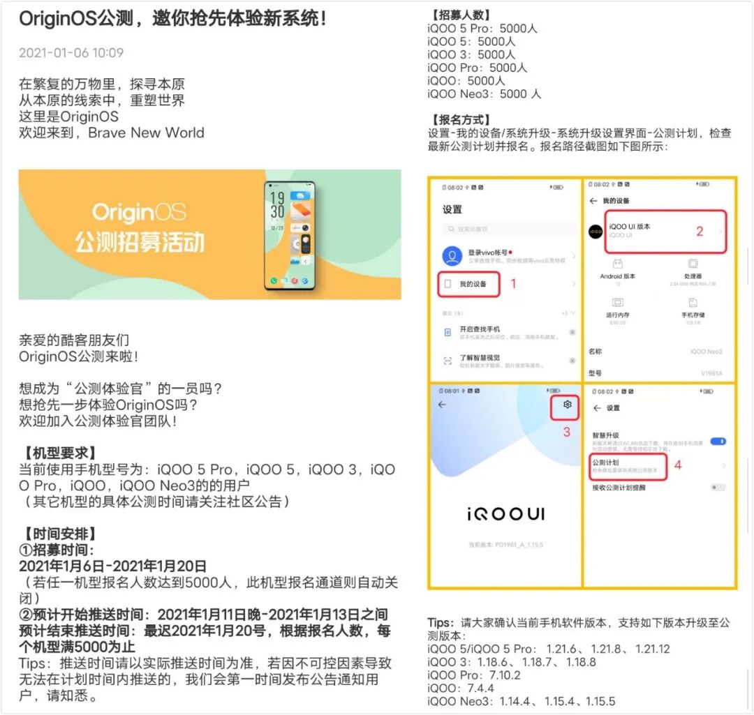 iQOO这边首批公测名单:iQOO 5、iQOO 5 Pro、iQOO 3、iQOO Pro、iQOO 、iQOO Neo3。将原系统版本升级最新后在【设置-我的设备-iQOO UI版本-右上角设置-公测计划】申请即可。