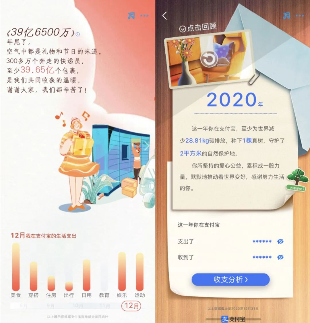 2021转眼已经来临,继微信年度账单、饿了么外卖2020年度账单/QQ音乐2020年度歌单、网易云音乐年度歌单、B站年度报告、钉钉年度报告出炉后,今天支付宝、美团两大平台的2020年度账单也可以查看了。