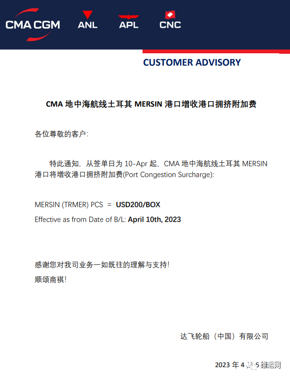 4月10日起,CMA地中海航线土耳其梅尔辛增收港口拥挤附加费PCS,每个集装箱300美元。