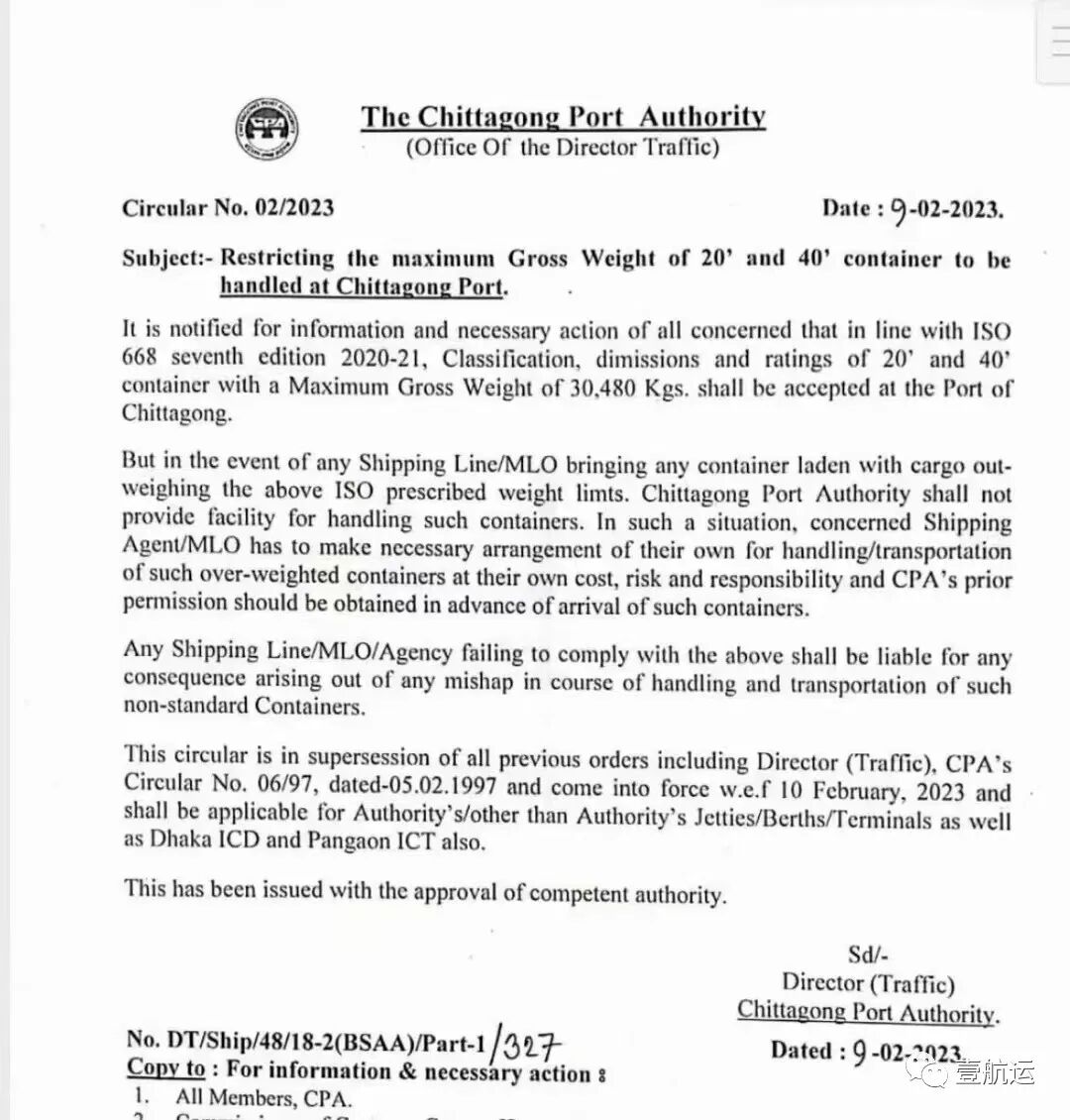 最新获悉:近期,孟加拉最大集装箱港口吉大港(Chittagong Port)出台了一则新的箱子重量限制规范--从2月10日起,在吉大港(Chittagong Port)装卸的集装箱,无论是20尺柜,还是40尺柜,最大毛重(Gross Weight)不得超过30.48吨!