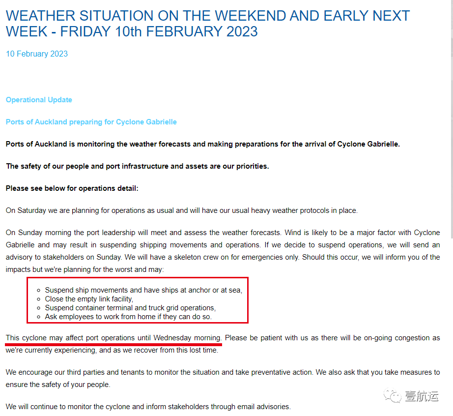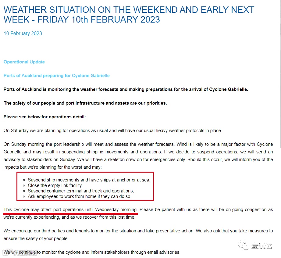 2月10日,奥克兰港(Ports of Auckland)发布通知,称港口领导层正在评估天气预报,并且正在做最坏的打算,一旦情况严重,港口方面或将会:暂停船舶移动,并让船舶抛锚;关闭空链接设施;暂停集装箱码头和卡车运输网络作业,同时让员工居家办公!