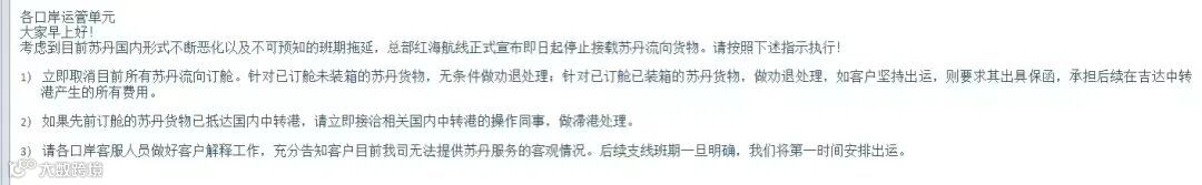 考虑到目前苏丹国内形式不断恶化以及不可预知的班期拖延,总部红海航线正式宣布即日起停止接载苏丹流向货物。请按照下述指示执行!