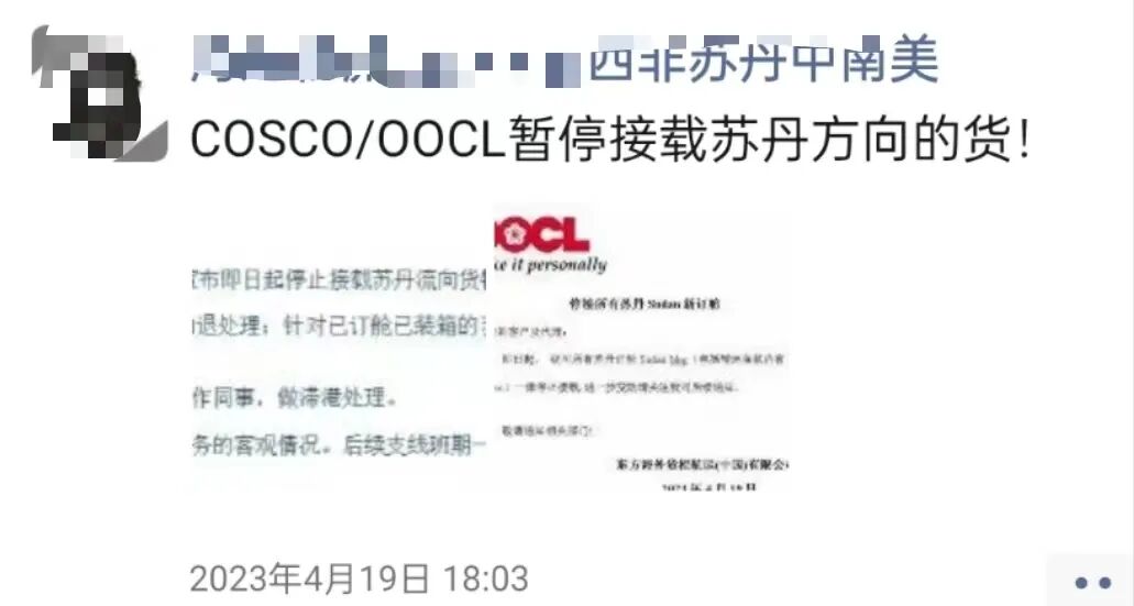 船公司OOCL发布通知,停接所有苏丹Sudan新订舱。马士基亦发布通知关闭喀土穆和苏丹港的办事处。