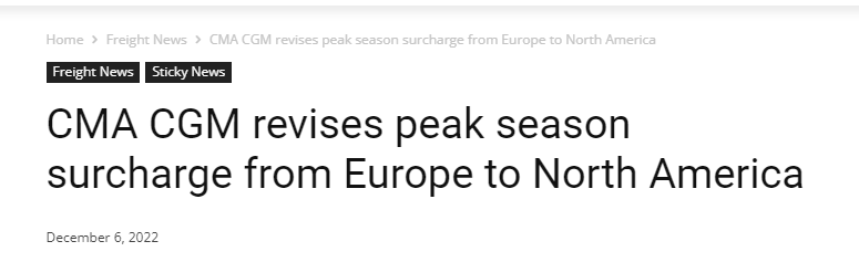 CMA CGM 表示,从葡萄牙到美国东海岸的旺季附加费保持在每 20 英尺 1,375 美元和每 40 英尺 1,550 美元。