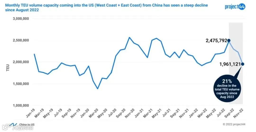 美国供应链数字服务公司project44表示,在疫情封锁期间达到创纪录的贸易水平后,自2022年夏末以来,从中国到美国的TEU(二十英尺标准集装箱)运量明显回落,包括8月至11月期间总箱量下降21%。