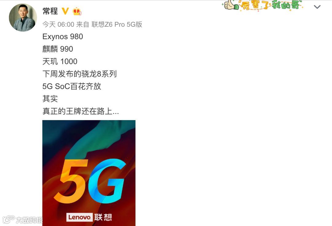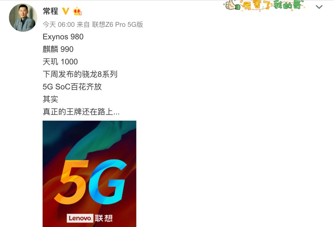 如上图所示,联想常掌柜表示“三星Exynos 980、麒麟990、天玑1000下周发布的骁龙8系列,5G SoC百花齐放,其实真正的王牌还在路上...”并配了一张联想5G的海报,疑似暗示联想要和去年一样拿下骁龙865的首发,不过别忘了PPT首发早就被8848拿走了![[并不简单]](https://cdn.10100.com/content/20251207/7dc00741-fc9b-432f-bc3f-6950671ebec0.png?x-oss-process=style/wmlogo)