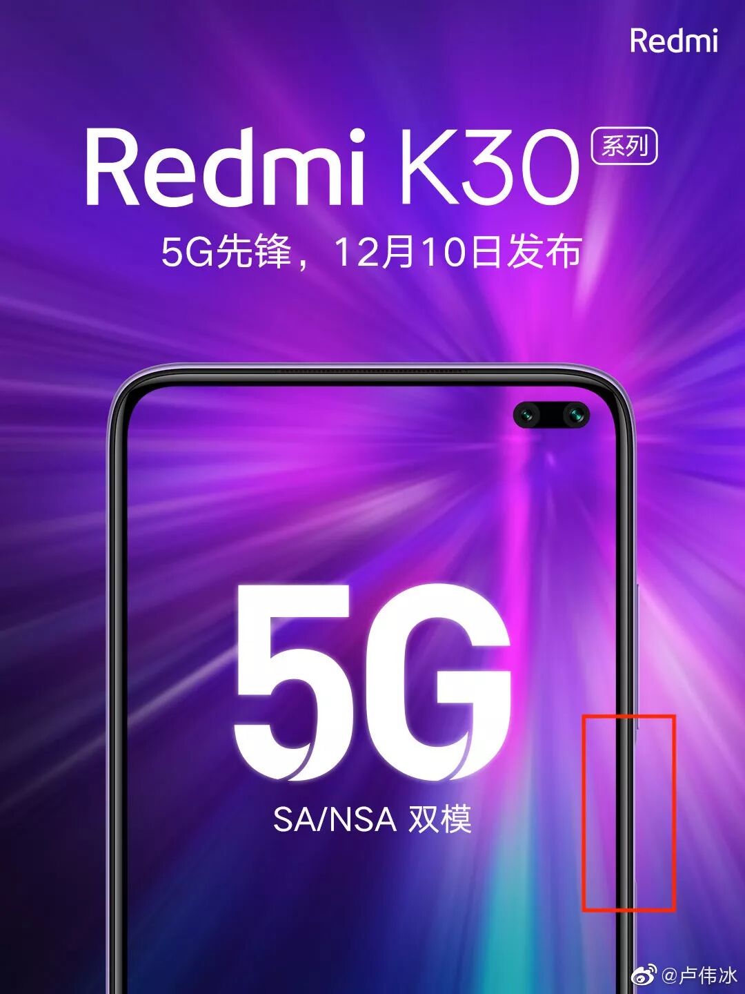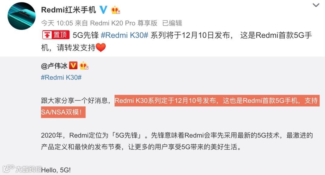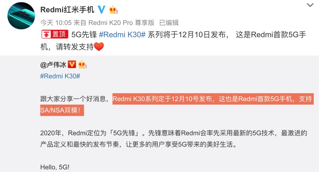 卢伟冰预热长达几个月的Redmi K30系列今天终于宣布了具体发布时间:12月10日发布,官方还表示Redmi K30系列是Redmi首款5G手机,支持NSA/SA 双模5G。