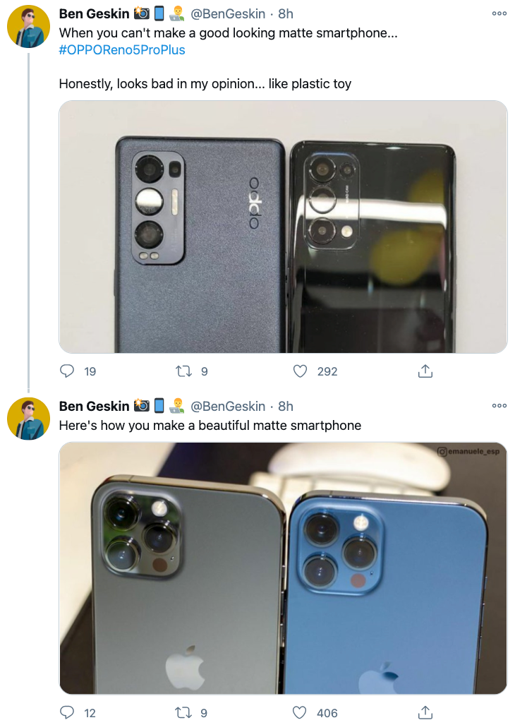 不仅对比了OPPO之前的亮黑色,前面还发了一组iPhone 12系列的玻璃后盖和磨砂后盖的图,不知道想表达什么
