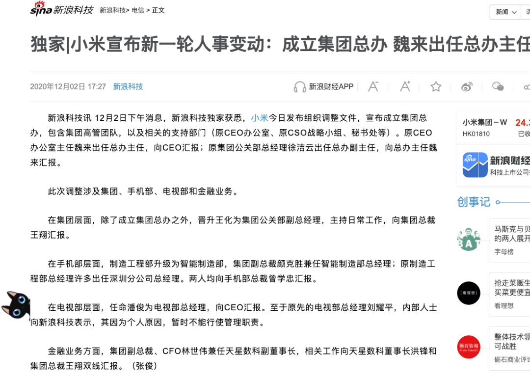 说完荣耀这边,小米最近也有大动作,小米官方宣布新一轮人事变动,成立集团总办,原CEO办公室主任魏来出任总办主任,向CEO汇报;原集团公关部总经理徐洁云出任总办副主任,向总办主任魏来汇报。