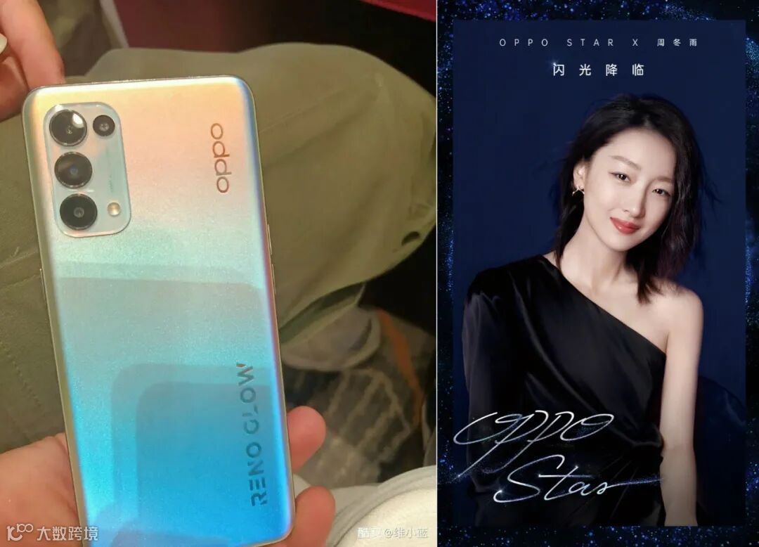 左图为OPPO Reno5系列的真机谍照,图源右下角水印,整体和上代Reno4系列变化不大,就是闪光灯位置有所小变化,另外多了一个渐变炫彩的新色;对了OPPO预热了全新代言人周冬雨,早前数码圈还因为周冬雨排列而对其印象深刻,不知道这位代言人大家打几分?