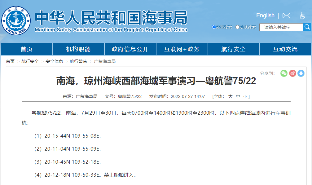 粤航警75/22,南海,7月29日至30日,每天0700时至1400时和1900时至2300时,以下四点连线海域内进行军事训练: