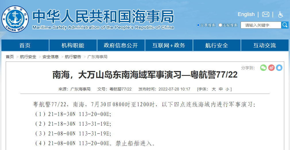 粤航警77/22,南海,7月30日0800时至1200时,以下四点连线海域内进行军事演习: