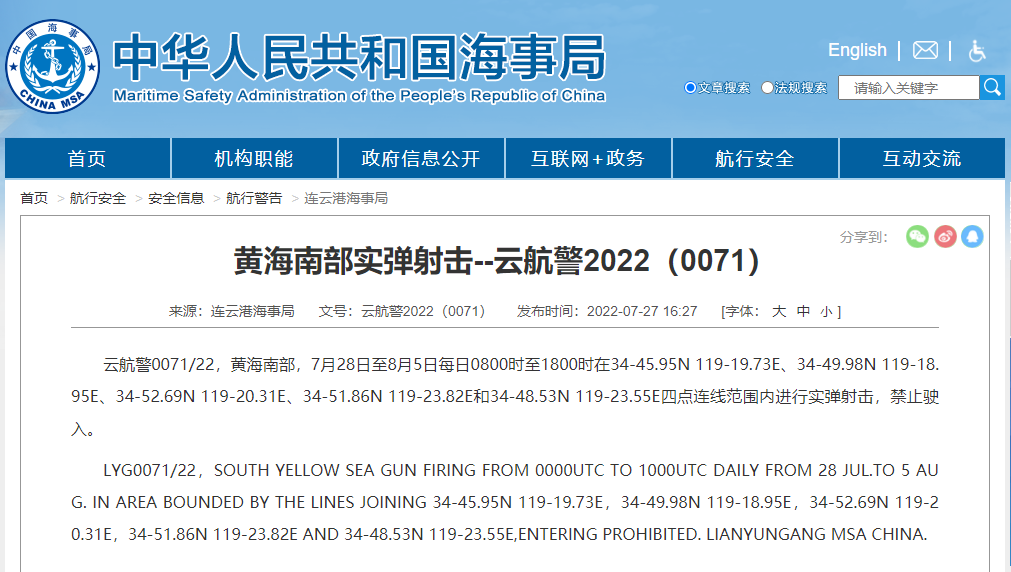 云航警0071/22,黄海南部,7月28日至8月5日每日0800时至1800时,以下四点连线海域内进行实弹射击:
