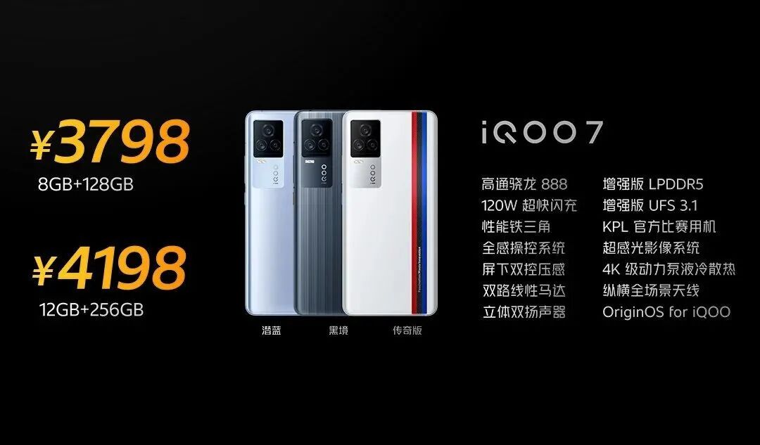 外观上,iQOO 7提供传奇版、黑境、潜蓝3个配色,机身三围162.2*75.8*厚8.7mm,重209.5g;个人实际上手后,黑色版本确实更有质感。