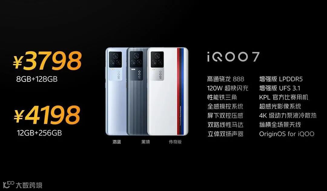 续航方面,iQOO 7配备2*2000双电芯 4000mAh电池容量,120W快充,最快15分钟充满,120W充电器 兼容最高65W PD协议 配备1.5m数据线,4096m㎡超大均热板,散热总面积达17730m㎡。