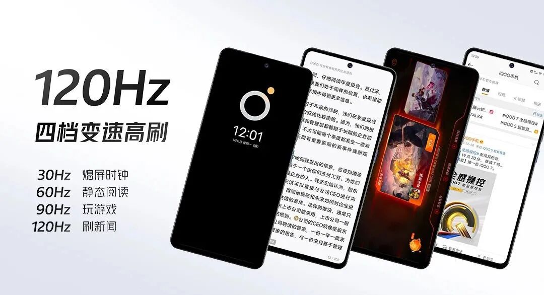 屏幕部分,iQOO 7采用6.62英寸2400*1080分辨率三星AMOLED居中单挖孔 钻排 硬性直屏,屏幕峰值亮度500nit,峰值激发亮度1300nit,120Hz屏幕刷新率(智能切换/60Hz/120Hz三个调节选项,接入原生90Hz游戏内选择90Hz帧率是自动适配90Hz),300Hz触控报点率,1000Hz瞬时触控采样率,4096级硬件背光, SGS低蓝光、低拖影认证,HDR10+⾼动态范围认证。