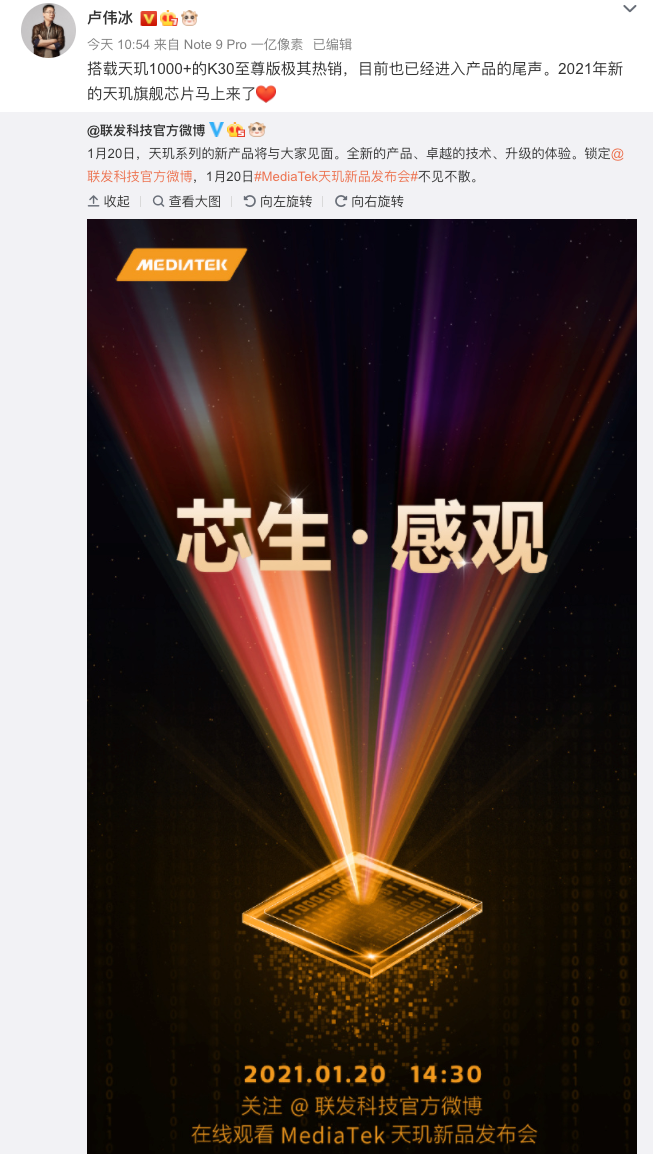 【前沿】1.20见 卢伟冰暗示红米K40或首发天玑 888只Pro版?