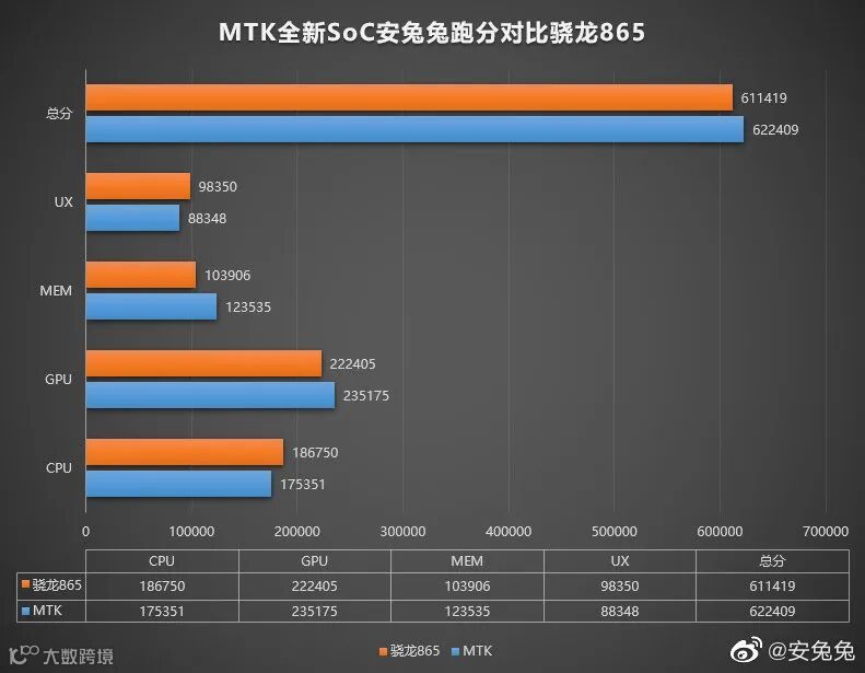 性能表现上,联发科新U安兔兔综合跑分622409,和无超频版的骁龙865基本持平,甚至还小超骁龙865。