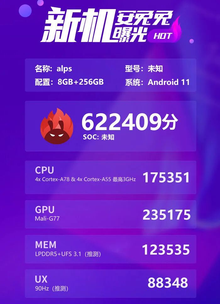 安兔兔披露的后台工程机跑分显示,联发科这颗全新SoC的CPU采用四核心Cortex-A78➕四核心Cortex-A55设计,GPU为Mali-G77,测试机配备8+256GB存储空间,屏幕分辨率为2300×1080,刷新率据推测应该是90Hz。
