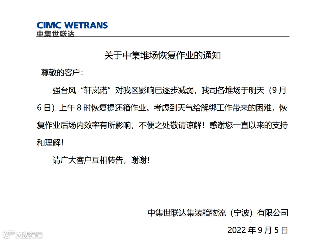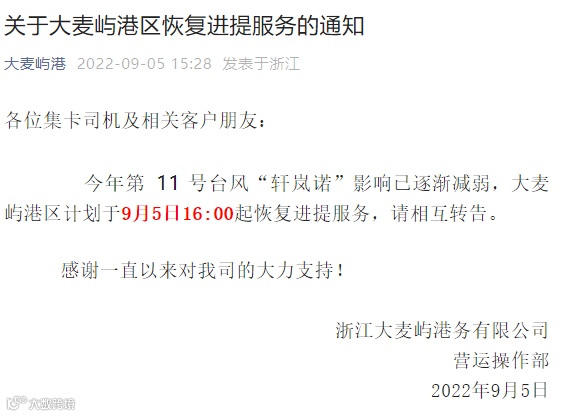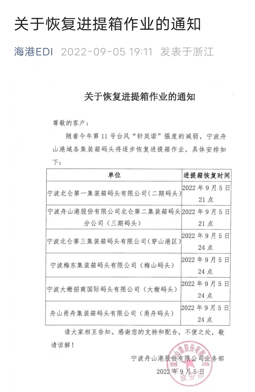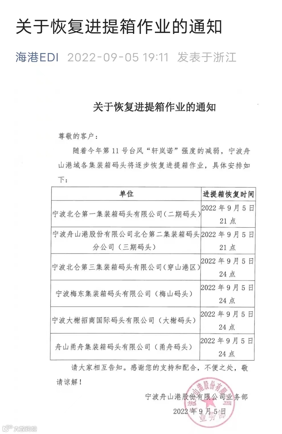 大榭招商国际码头:9月5日24时恢复提箱作业。