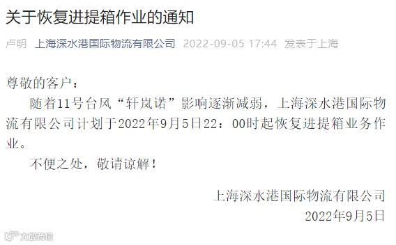 上海深水港国际物流有限公司于9月5日(昨日)22:00时起恢复提箱作业。